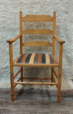 Der Bezug dieses Stuhles besteht aus verschiedenen, zusammengenähten Lederstreifen, die mit vielfarbigen Ziernähten abgesteppt wurden.